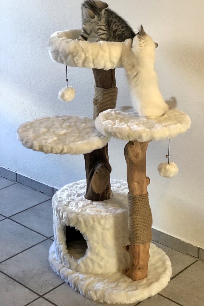 Dieser Design-Kratzbaum hebt sich von Standardmodellen vor allem durch die Verwendung hochwertiger Naturholzstämme ab.