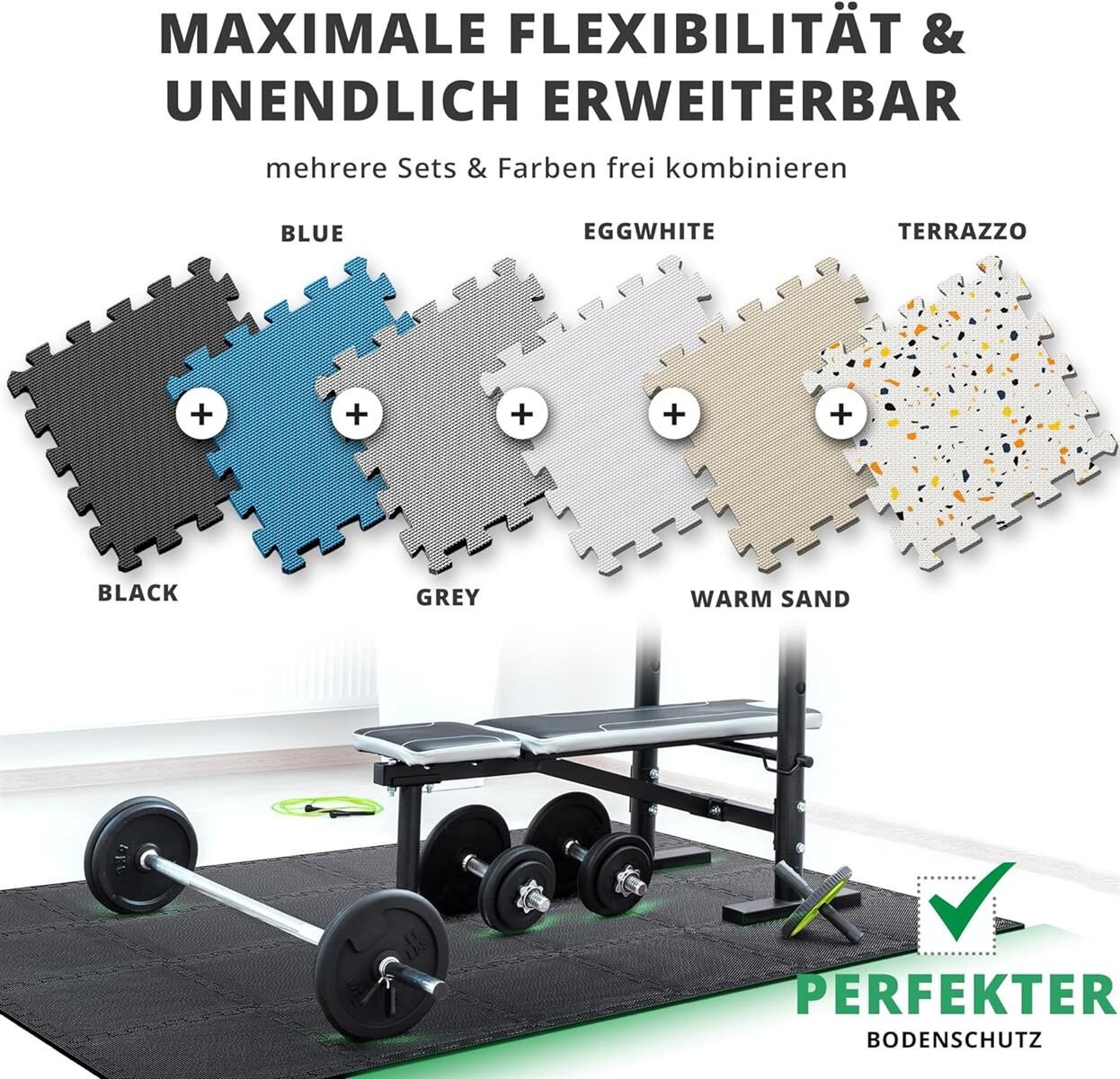 Durch die unendlich erweiterbare Puzzleform, hat man beim Zusammenstellen des perfekten Bodenschutzes bereits viel Freiraum.