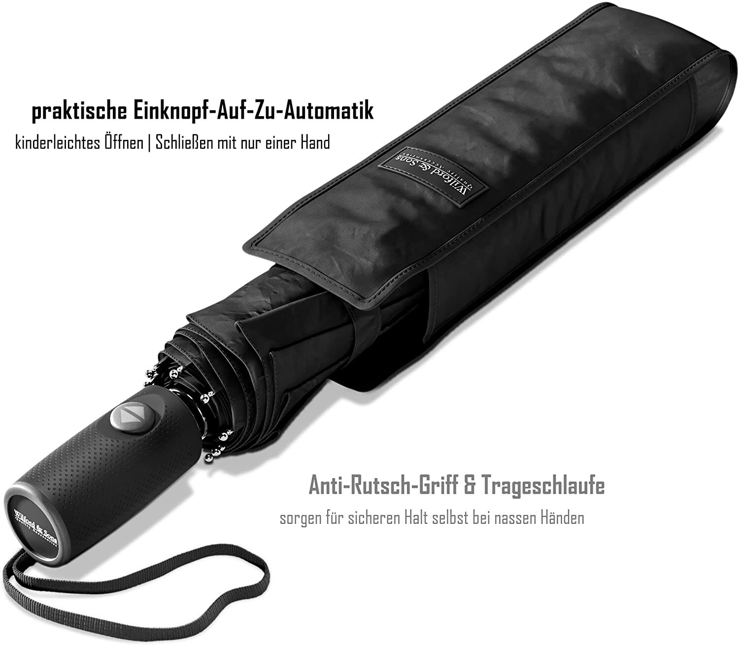 Stehen Sie nie wieder im Regen und öffnen/schließen Sie Ihren Regenschirm ganz bequem, schnell und zuverlässig mit nur einem Knopfdruck. Der gummierte Anti-Rutsch Griff mit Handschlaufe sorgt für sicheren Halt selbst bei nassen Händen und ermöglicht ein kinderleichtes Aufhängen, Verstauen und Trocknen, wo immer Sie auch sind.