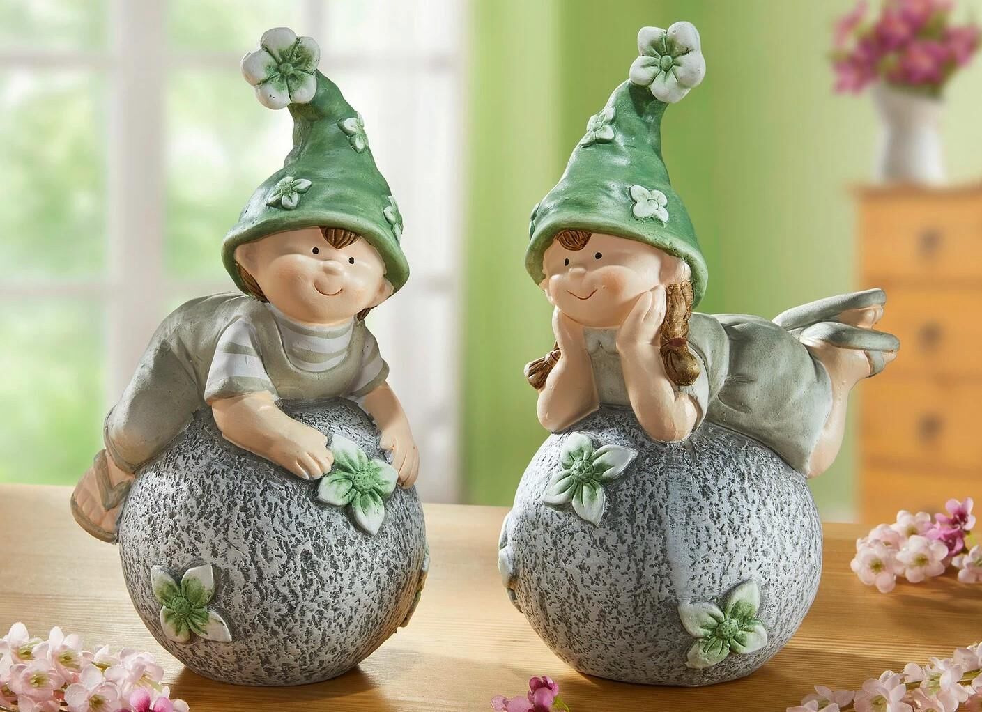 Diese bezaubernden Wichtelkinder haben es sich für eine kurze Pause auf 2 Steinen gemütlich gemacht. Sie tragen grüne, mit Blumen bestückte Zipfelmützen und wurden liebevoll aus Terrakotta gestaltet.